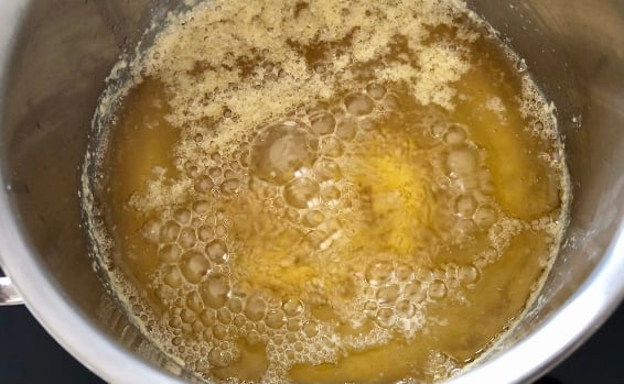 Die Butter wird auf kleiner bis mittlerer Hitze geschmolzen. Je nach Buttermenge, Topf und Hitze köchelt sie dann 30 - 50 Minuten. Nicht rühren und nicht anbrennen lassen. Du solltest immer in der Nähe sein und beobachten. Der Wasseranteil verdampft, das Eiweiß setzt sich ab und nach und nach klärt sich das Fett. Es beginnt nussig zu duften und knackig zu brutzeln. Warte genügend lange, bis das Fett wirklich klar ist - sonst könnte dein Ghee ranzig werden. Das geklärte Fett gießt du durch ein ins Sieb gelegtes Küchenpapier in eine hitzebeständige Schüssel. Und von dort gießt du dein Ghee ins Glas. Erst erkalten lassen, dann schließen. Bei Zimmertemperatur aufbewahren, im Kühlschrank wird es zu fest.