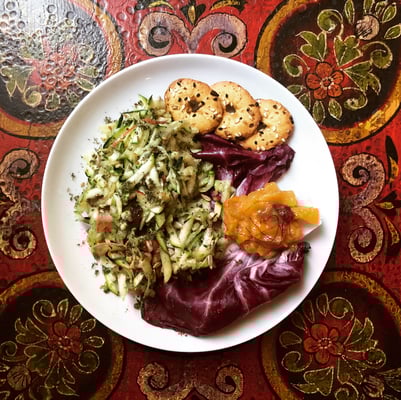 Gestern gab es geraspelten Zucchini-Apfel Salat mit Sonnenblumenkernen, Zaatar und Olivenöl. Dazu ein Raddichioblatt, einen Löffel Chutney und einige Cracker.