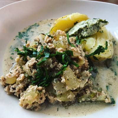 Für den Eintopf nehme ich 2 Schmorgurken, eine Schalotte, 100g Soja-Granulat, Dill, eine Frühlingszwiebel, Salz, Pfeffer, Kümmel und Muskat. Die Gurken schälen und entkernen, das Soja-Granulat mit heißem Wasser einweichen. Alle Zutaten werden in Ghee gut angeschmort und mit 250ml Hafersahne aufgegossen. 30 Minuten köcheln. Dazu gibt es Pellkartoffeln und etwas Kräuterbutter.