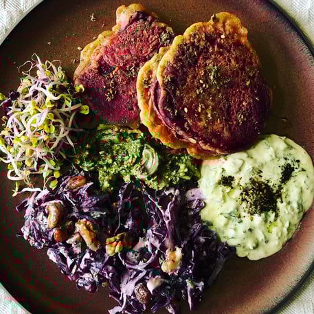 Gestern gab es rote Bete, Rotkohl, Tahin, Petersilienpesto und Sprossen. Die rote Bete kochen, schälen und in dicke Scheiben schneiden. Kichererbsenmehl mit Wasser anrühren, so dass ein dickflüssiger Teig entsteht. Mit Salz, Kreuzkümmel und etwas Ras el Hanout würzen.
